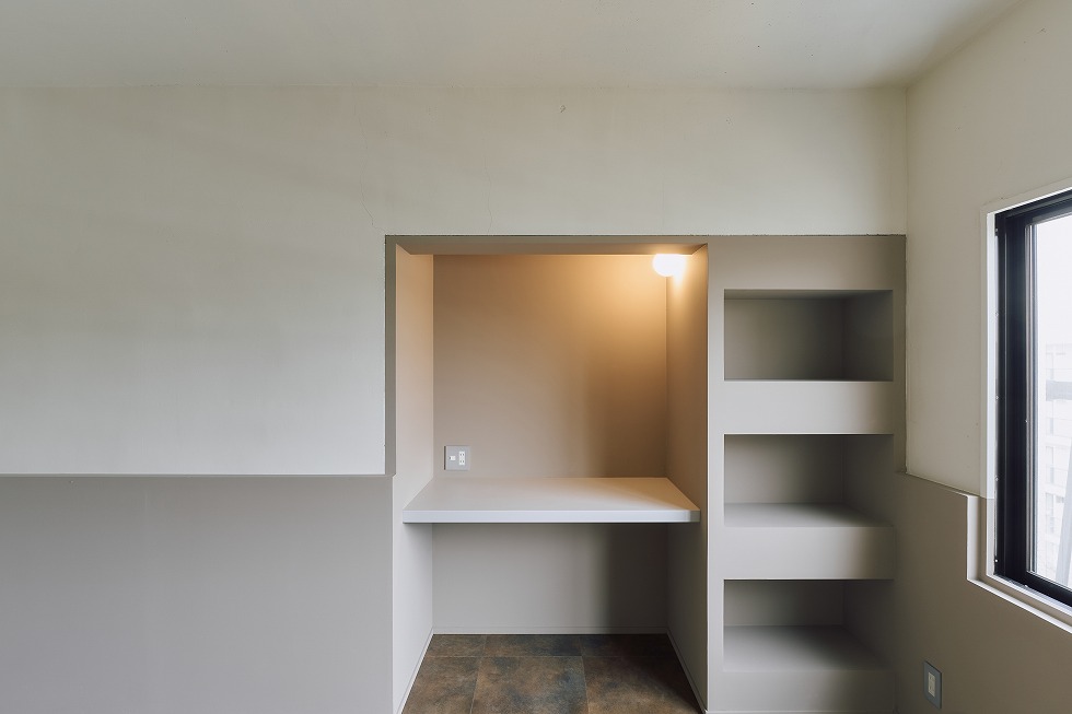 室内の電気配線のほとんどを床下配線とし、コンセントやスイッチが必要な最少部分だけ腰壁を起こして、それ以外の部分はRC躯体をあらわした仕上がりとすることで、下地野材の量を減らしており、また腰壁高さも3×6板のP.Bボードをなるべくカットせずにそのまま貼ることができるように910mmの高さに設定して残材の量を減らすことを試みています。