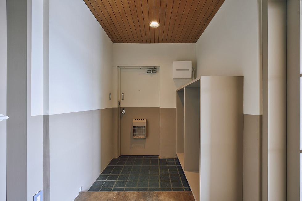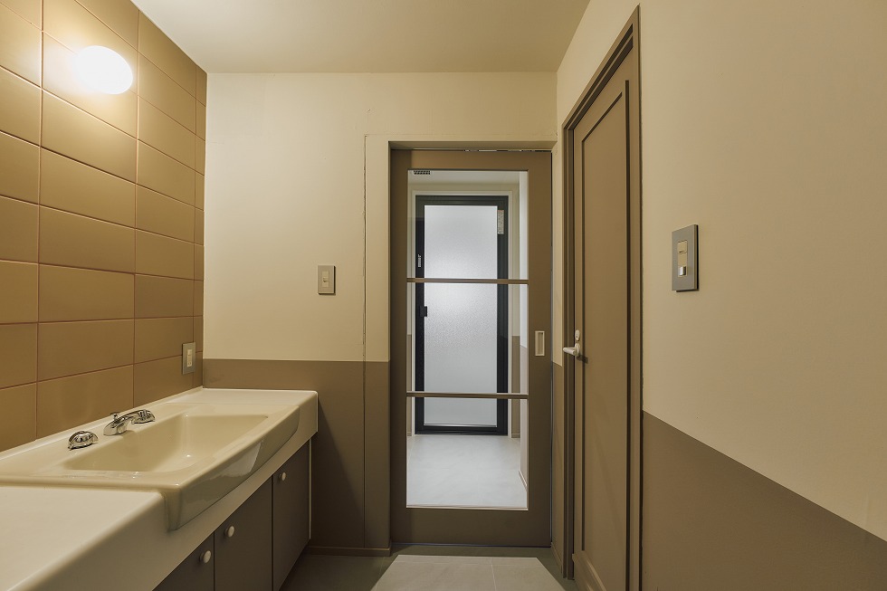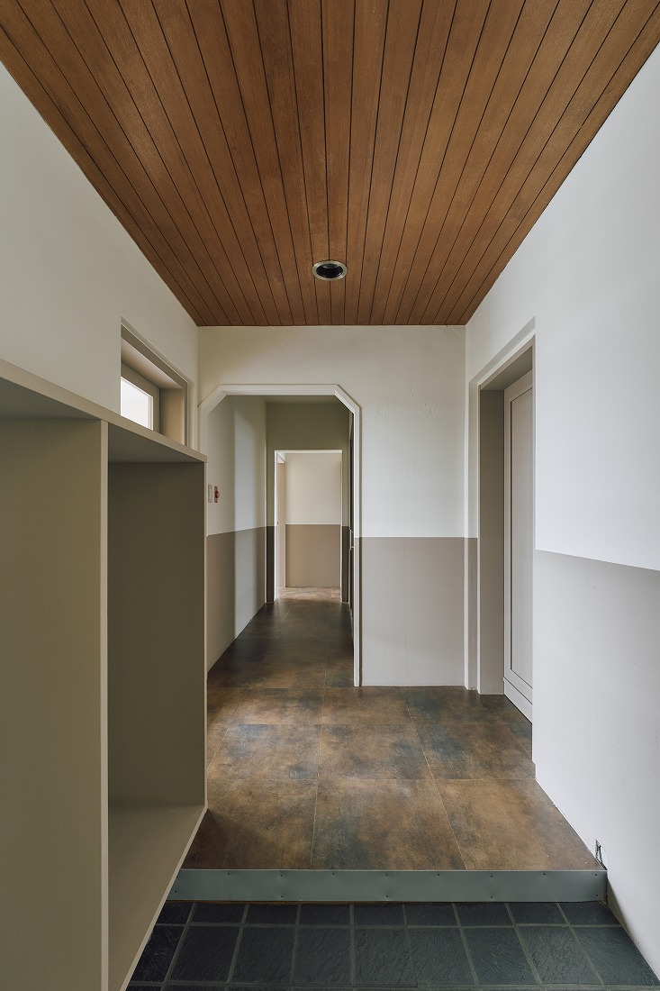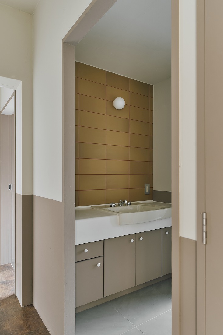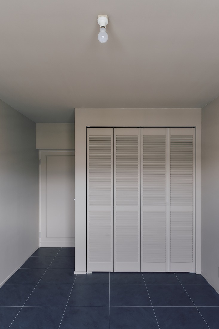 床の仕上げにはフローリングやタイルなど材料単価が高くなってしまう素材は使用せず、まず初めにPタイルにて統一することを決めていました。各部屋ごとでのPタイルの使い分け、見切りの付け方で安っぽさが出てしまわないように調整しています。この部分は、宮崎駿さんが自社ビルやオフィスのデザインをされる際に一番安価な材料帯から選定は行うが、組合せや色味によってバランスを調整しており、それこそがデザインである。とインタビューでお話しされていたことにインスピレーションを受けました。
