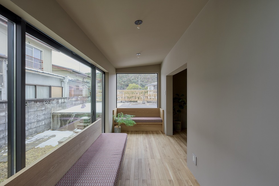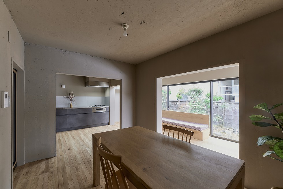 RC造部分は、構造壁でほとんど解体して広げることができない為、洗面・お風呂をはじめキッチンはシンプルにまとめながら、RC母屋に付属している木造部分を大きなリビングとして採用しました。天窓を新しく設け、耐力壁の部分を除いて全てガラスサッシで外に広げることで光を取り込み、長さ4mと2mのソファを家具製作しました。
