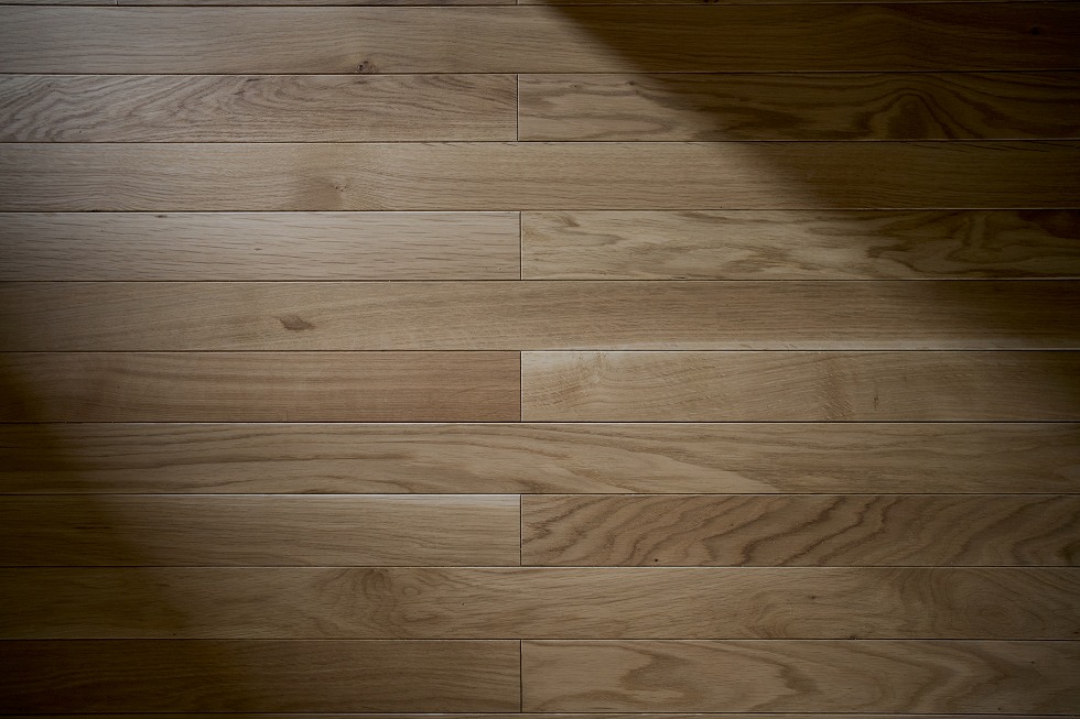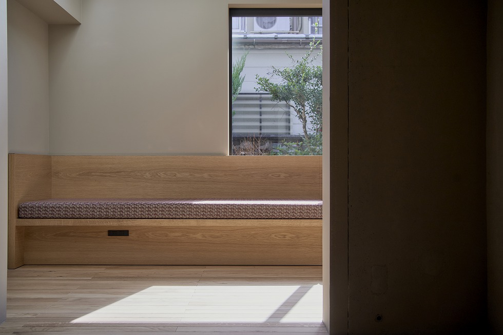 床材には、幅60mm、長さ1,820mm定尺の無垢オーク材を使用しました。床材の貼り方を検討するために玄関から奥庭まで何度も墨出しをして検討しながら貼り方向、位置、継ぎ目を調整して貼っていますが、これがおそらく無意識に視覚的に認識していて、すごく気持ち良い。