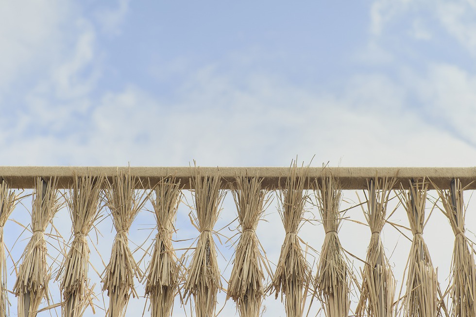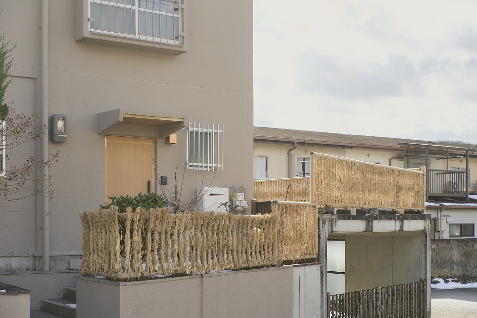 そこで試みてみたものがアルミフェンス自体は残しながら、フェンスに藁を巻きつけ、見える部分には麻紐を巻きつけることでした。硬さや冷たさを見た目から連想するコンクリートに対しての藁/麻といった自然素材は、柔らかさ、軽やかさ、和を感じさせるとても気持ち良い組み合わせです。