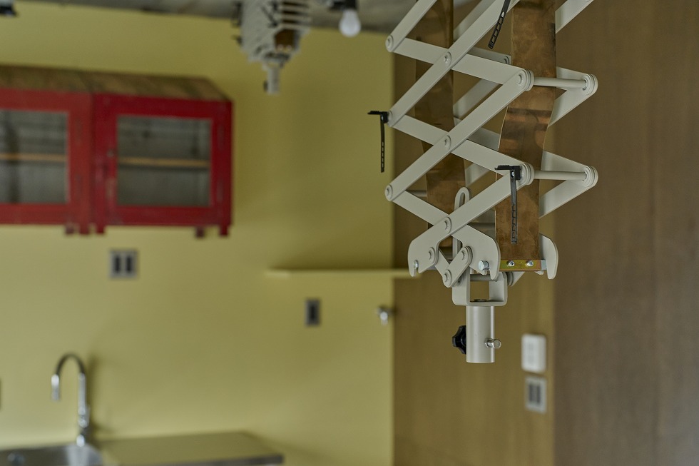 肝心のカメラの設置としては、床置き三脚を使用するのが通常ですが、毎回の片付けが必要になる手間を省く為に、パンタグラフという吊り下げ式器具を天井に取付け、位置移動しながらカメラ撮影ができるようにしています。